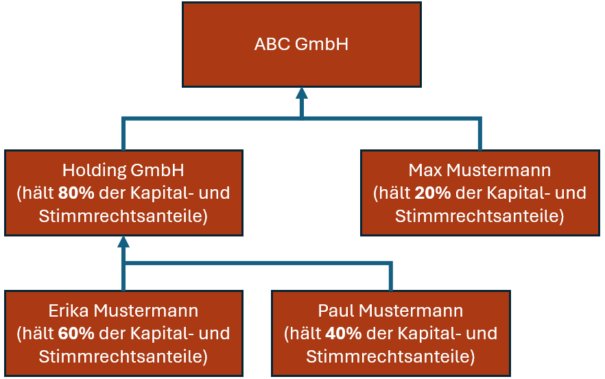 Direkter Anteilseigner der ABC GmbH ist eine juristische Person. Erika Mustermann hält mehr als 50% der Kapital- und Stimmrechtsanteile an der Holding GmbH. Aufgrund der Mehrheitsbeteiligung sind Erika Mustermann die 80% zuzurechnen.