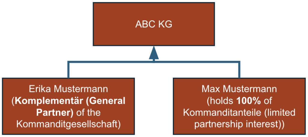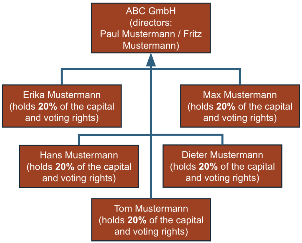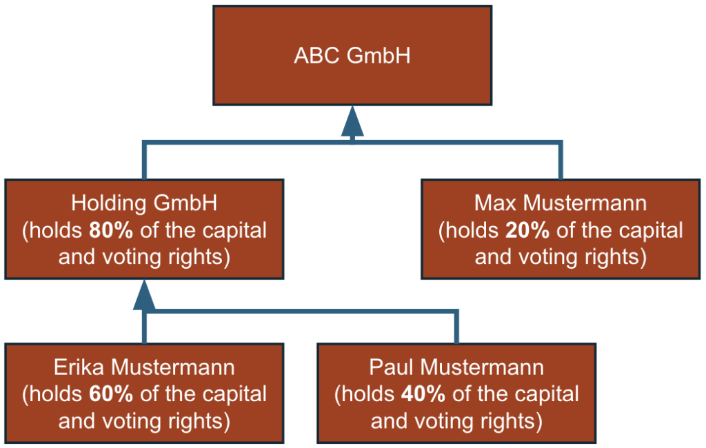 Due to her position as general partner, Erika Mustermann exercises control in other ways and is therefore considered a beneficial owner. Max Mustermann holds more than 25% of the capital shares and is also considered a beneficial owner of ABC KG.